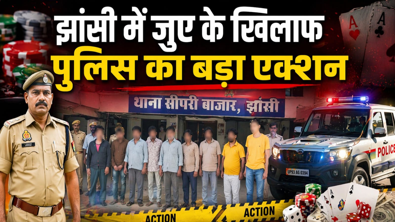 Edit by Dherendra Raikwar झांसी में जुए के खिलाफ पुलिस का बड़ा एक्शन झांसी पुलिस अपराधियों के खिलाफ लगातार सख्त रुख अपनाए हुए है… सीपरी बाजार थाना क्षेत्र में पुलिस ने एक बड़ी कार्रवाई करते हुए संगठित तरीके से जुआ खेल रहे 8 लोगों को गिरफ्तार किया है… पुलिस ने मौके से नगदी, मोबाइल फोन और ताश के पत्ते भी बरामद किए हैं… यह कार्रवाई साफ तौर पर दिखाती है कि कानून तोड़ने वालों के लिए अब कोई राहत नहीं है… झांसी में अपराध के खिलाफ चल रहे अभियान के तहत सीपरी बाजार पुलिस को एक बड़ी सफलता हाथ लगी है… मुखबिर की सूचना पर पुलिस टीम ने छापेमारी करते हुए शुभम उर्फ केला के मकान में दबिश दी… जहां अंदर संगठित होकर हार-जीत की बाजी लगाकर जुआ खेला जा रहा था… पुलिस