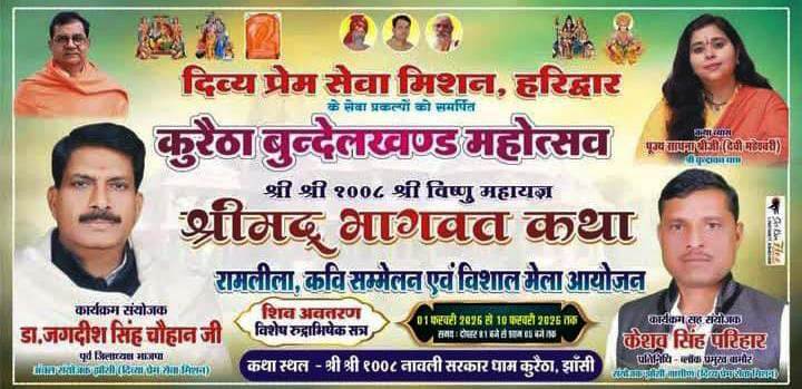 गुरसराय झांसी।दिव्य प्रेम सेवा मिशन, हरिद्वार के सेवा प्रकल्पों को समर्पित बुन्देलखण्ड कुरैठा महोत्सव का भव्य आयोजन आगामी 01 फरवरी से 10 फरवरी 2026 तक किया जाएगा। महोत्सव को लेकर क्षेत्र में उत्साह का माहौल है तथा आयोजन स्थल पर तैयारियां अंतिम चरण में पहुंच चुकी हैं।